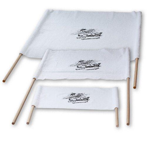Das Aufguss-Wedelsegel die neue Innovation für die Sauna – exklusiv von Finnsa. Finnsa hat drei Wedelsegel entwickelt, welche die üblichen Wedeltücher ersetzen bzw. in der Anwendung unterstützen sollen. Die kräftigen Tücher mit hochwertigem Stick sind links und rechts mit einer abgenähten Tasche versehen. Dort passen die mitgelieferten Holzstäbe hinein (bei Bedarf leicht zu kürzen). Durch die Holzstäbe kann das Tuch nicht in sich zusammenfallen und Sie erhalten ohne großen Kraftaufwand eine hohe Luftbewegung.
