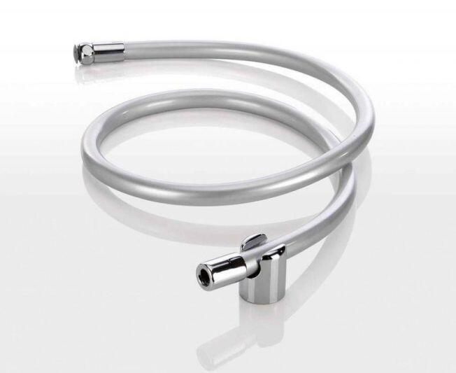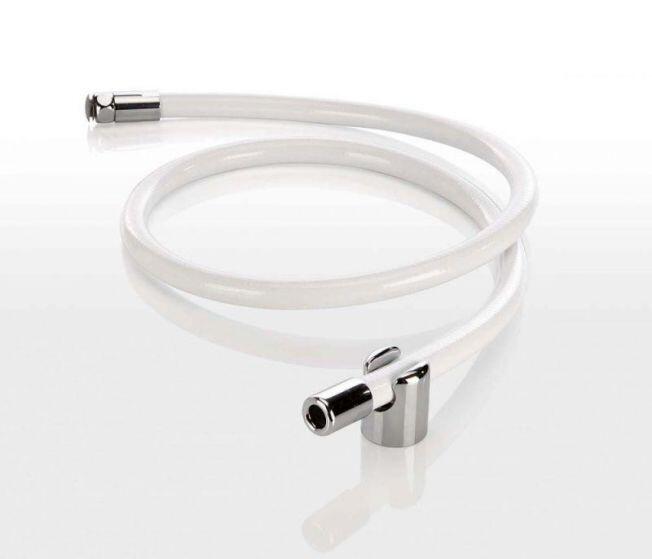 Druckbrause aus verchromtem ABS mit weißem Schlauch und Überwurfmutter 1/2”. Nur wenn der Druckhebel gedrückt wird, fließt das Wasser und der Strahl kann durch den Druck reguliert werden. Ein maximaler Dauerstrahl kann durch das Hochklappen des Druckhebels justiert werden.
