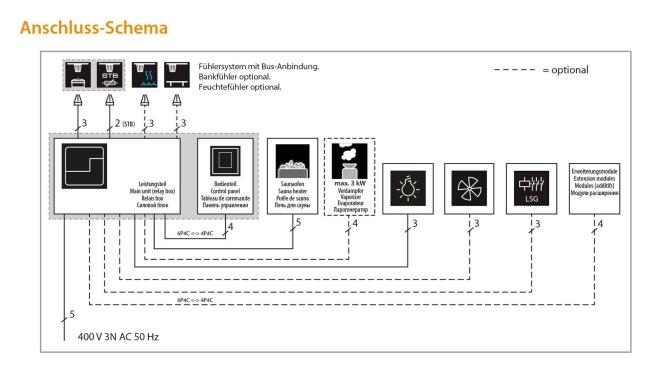 - Regelbereich zwischen 30 °C und 70 °C im Feuchtebetrieb bzw. 40 °C und 115 °C im Saunabetrieb