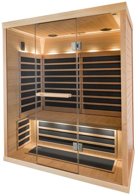 Das EvenHeat™ System der Infratoflächenstrahler erwärmt jeden Teil des Körpers noch gleichmäßiger und das mit niedrigster elektromagnetischer Strahlung (EMS) aller aktuellen Infrarot-Wärmesysteme. Die Infrarotkabinen der T-Serie bestehen innen und außen aus kanadischem Hemlockholz. Freien Blick gibt die rahmenlose Glasfront und macht die T-Serie zu einem echten Hingucker. Ausgestattet mit einem modernen Kontrollgerät zur Steuerung der bluetooth Lautsprecher, der indirekter Beleuchtung und des dimmbaren Farblichtsystem. Des Außerdem ist die Steuerung WiFi fähig und kann neben einer App im lokalen W-Lan Netz auch über die Sprachsteuerung Siri, Google und Alexa angewählt werden. Zusätzlich sind auch die Sitzbank und der farblich passende keramische Fußboden mit Wärmequellen ausgestattet.