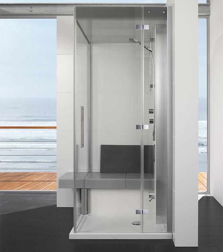 Exklusiv anmutend präsentiert sich das Dampfbad Aspen S. Es ist mit einer Grundgröße 120 x 100 cm das kleinste Dampfbad im Repabadsortiment. Bei der Keramiksitzbank mit integrierter Heizung kann aus zwei Längen gewählt werden. Die Sitzbank endet entweder mit dem Glas oder wird außerhalb der Glasabtrennung weitergeführt und dient als bequeme Ablage und Wärmequelle z.B. für Handtücher. Die beheizten Keramiksitz- und Rückenelemente verwöhnen mit wohliger Wärme. Eingehüllt in feuchten Wasserdampf steht der vollkommenen Entspannung von Körper, Geist und Seele nichts mehr im Wege. Zusatzoptionen wie Aroma, Farblicht, Entertainment, Nebel und Sole runden das Wohlfühlerlebnis ab. Aber auch das normale tägliche Duschen ist im Dampfbad Aspen S ein Genuss.