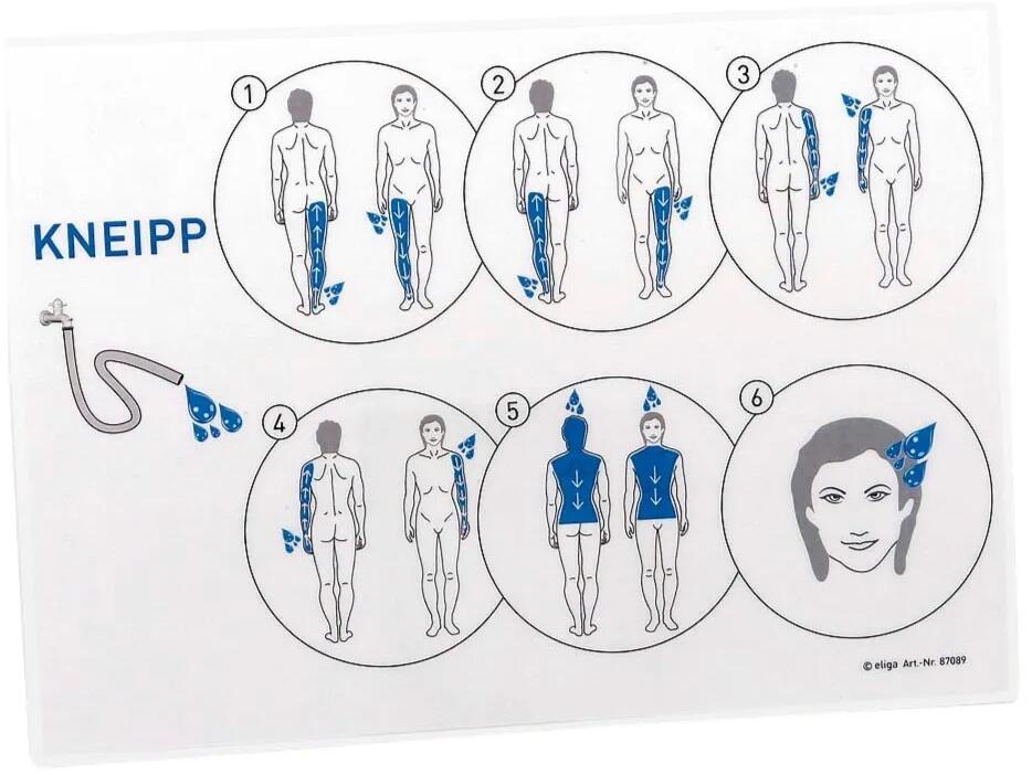 Der Kneippguss beginnt rechts am Fuß an der Körperrückseite und wird bis zum Rumpf rückseitig durchgeführt, anschließend wird der Wasserguss an der Beinvorderseite wieder abwärts geführt; dann gleicher Ablauf bei linkem Fuß, rechtem und linkem Arm, Körper, Hals, dann evtl. Gesicht.