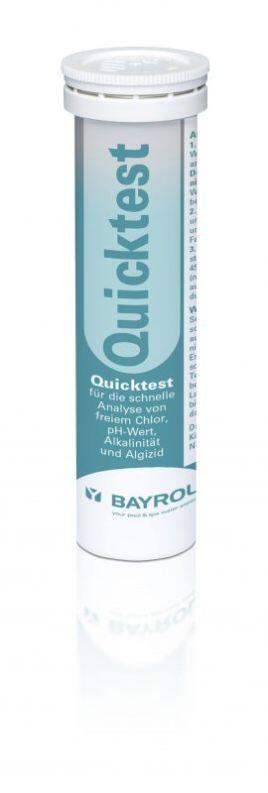Quicktest von Bayrol mit dem Teststreifen für die schnelle und einfache Analyse von pH-Wert, freiem Chlor, Alkanlinität und Gehalt an Desalgin bzw. Desalgin Jet. Die Kissen auf dem Teststreifen des Quicktest von Bayrol ändern ihre Farbe entsprechend der Testwerte Ihres Schwimmbadwassers/Whirlpools. Durch einfachen Farbvergleich können die Analysewerte auf dem Quicktest von Bayrol abgelesen werden.